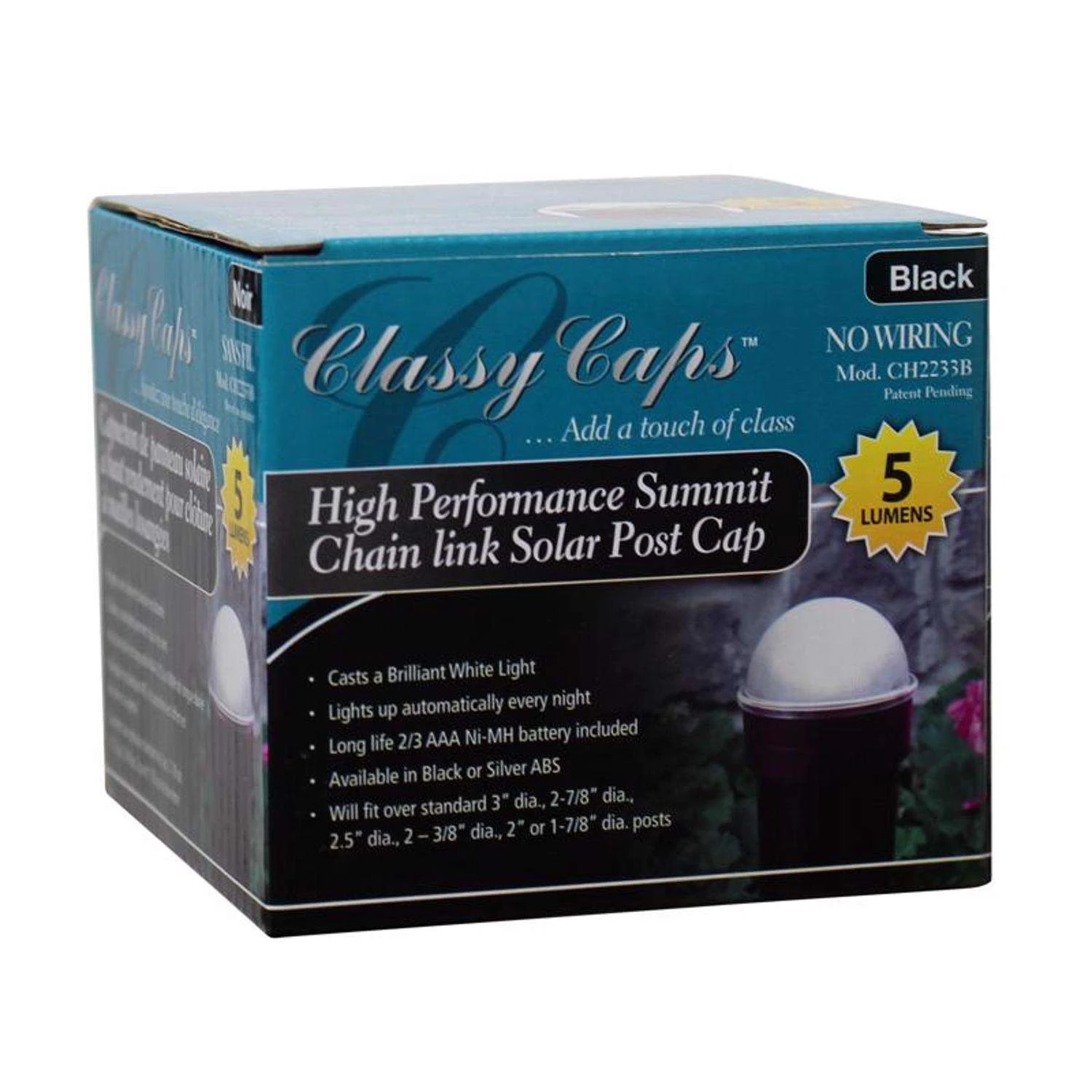 Add a touch of class to your chain link fence with our high performance Summit solar post cap. This one of a kind design by Classy Caps will compliment your existing chain link posts. Turns on automatically every night casting a brilliant white light onto the surrounding area. Manufactured to fit over six standard chain link fence posts – 3″ dia., 2-7/8″ dia., 2.5″ dia., 2-3/8″ dia., 2″ or 1-7/8″ dia. Long life 2/3 AAA Ni-MH battery included Quick and easy do it yourself installation Provides upto 12 hours of light when fully charged