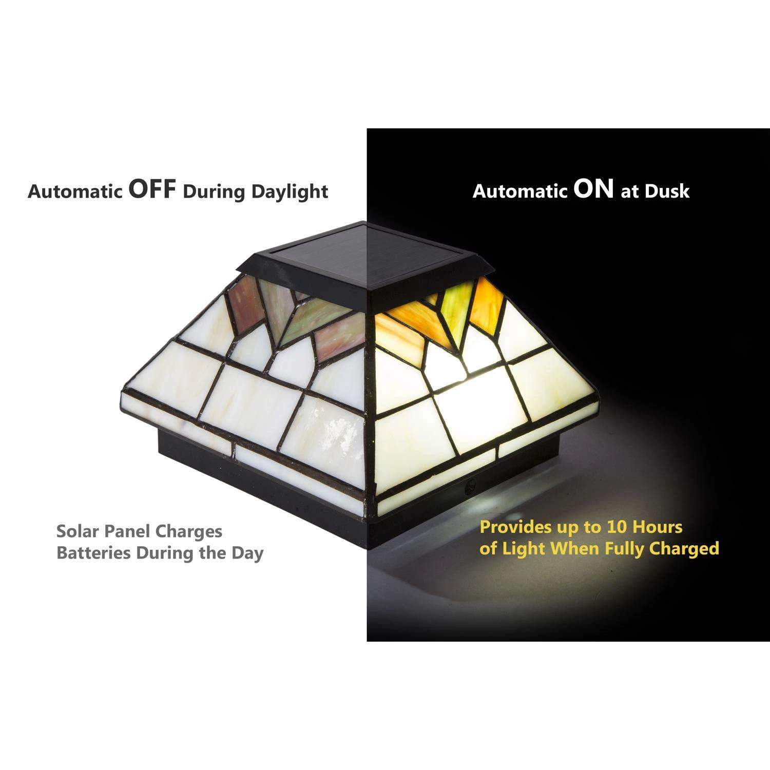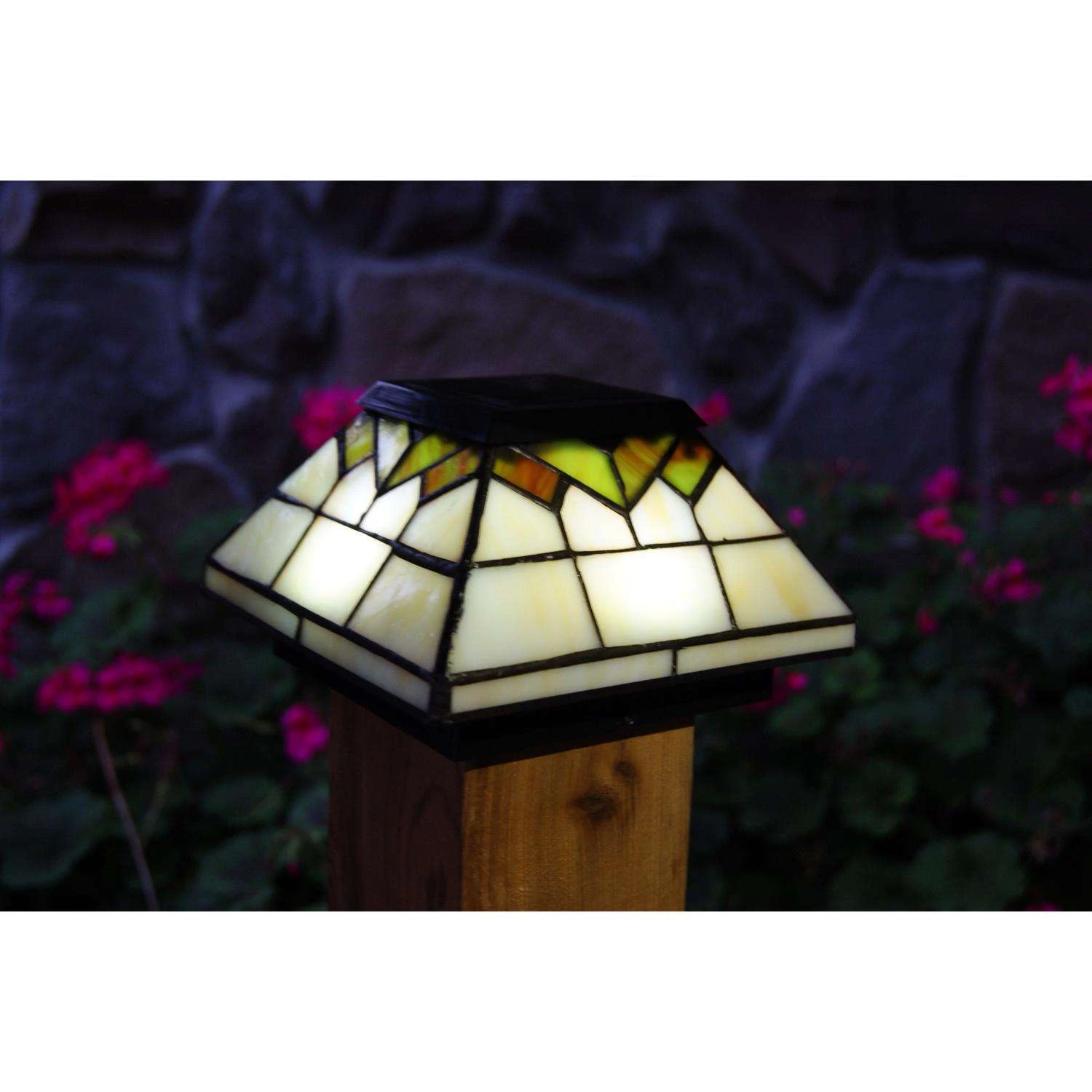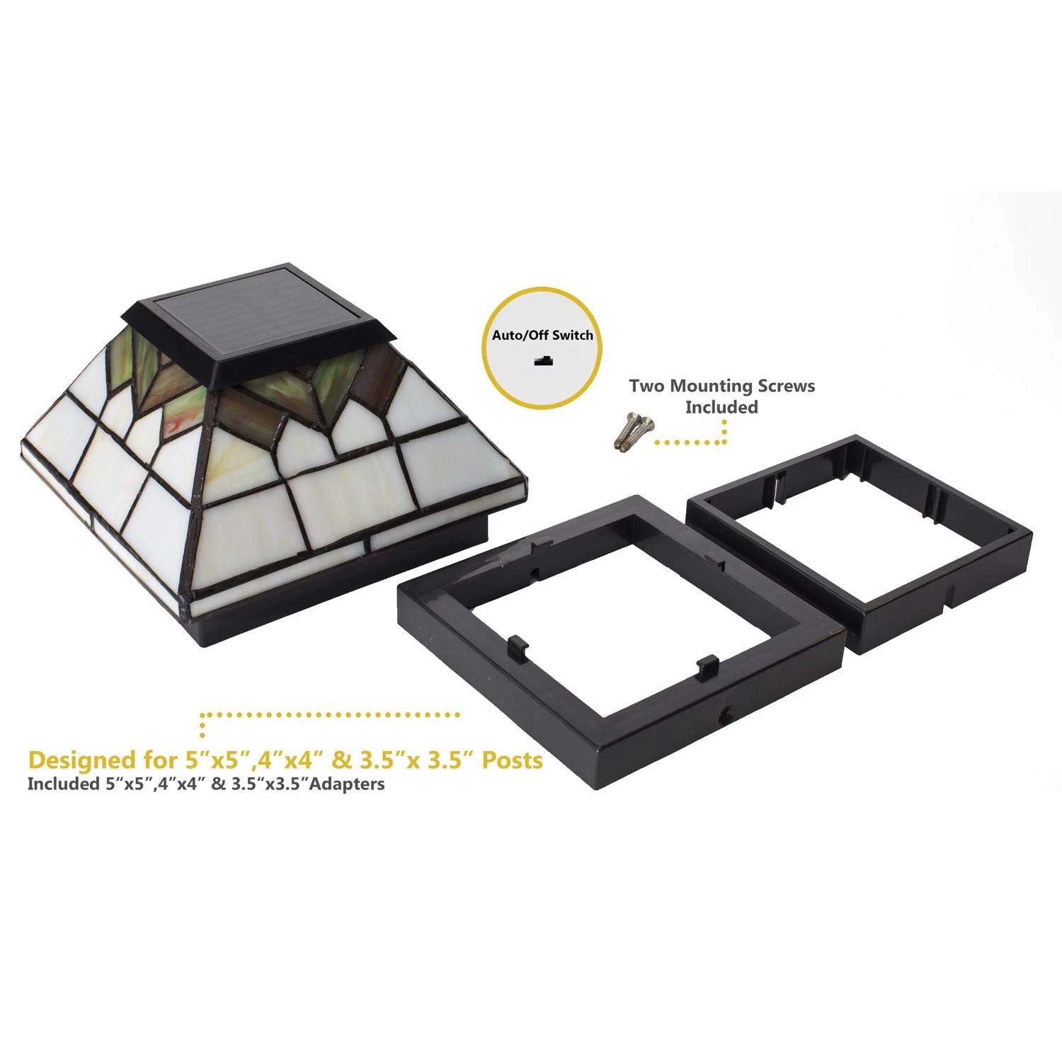 The stylishly graceful Wellington solar post cap will add a distinct charm to your home. It is designed using four high-output LEDs to illuminate the beautiful handcrafted stained glass and the surrounding area. These will fit over a 5 in. x 5 in., 4 in. x 4 in. or 3.5 in. x 3.5 in. post. High performance solar lights – stays lit for up to 10 hours Lights up automatically every night Quick and easy do it yourself installation