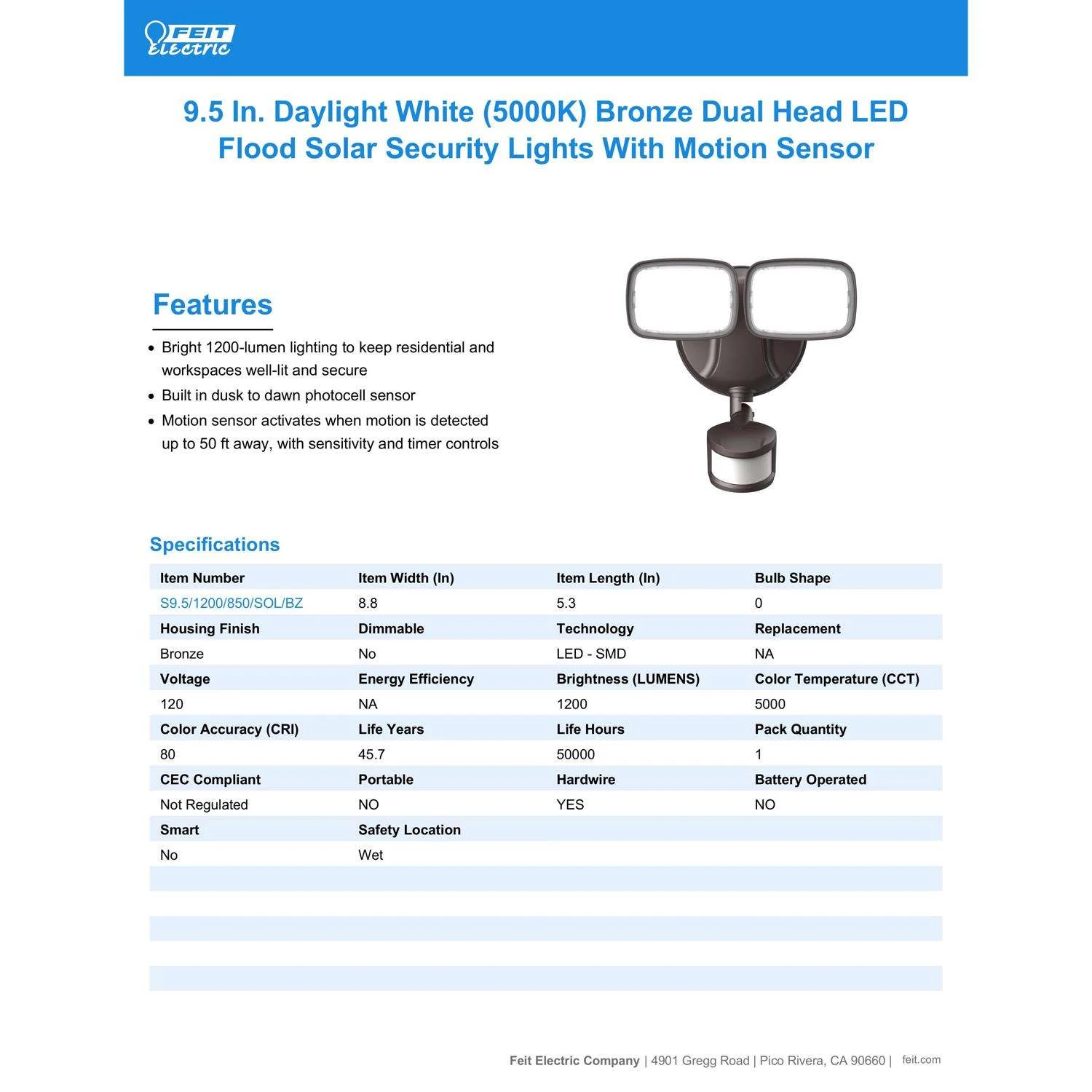 | Search Field | Feit LED Motion-Sensing Solar Powered LED Bronze Security Floodlight Outdoor Lighting Security Lighting OUTDOOR AREA LIGHTING LED MOTION ACTIVATED FEIT ELECTRIC CO Feit LED |