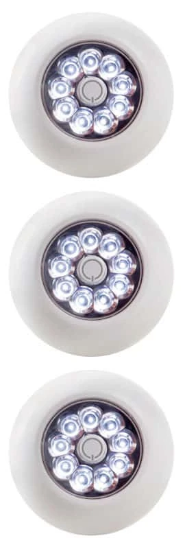 Brighten dark spaces around the home with this Fulcrum 30016 tap-light three pack. The round-shaped lights work well as under-cabinet lighting or to make stored items in a closet or pantry more visible. They also come in handy in a dark stairwell or hallway. The lights also prove useful when out and about, whether in the car, on a boat, in an RV or when camping. With nine ultra-bright LEDs, the lights deliver unparalleled illumination lighting a larger area than other puck-type lights. For fast, easy installation, simply use the supplied mounting tape or screws to mount the lights onto almost any surface no wiring or plugs required. The lights use three AAA batteries (sold separately) and their mounting plates make installation and battery replacement a snap. Best of all, the tap lights turn on/off with just a touch. In addition to providing everyday lighting, the tap lights can also be quickly detached for use as portable emergency lights. The attractive tap lights offer a sleek, simple design that complements any decor. Easy to use Versatile instant lighting solution for any dark space-closets, cabinets, autos, boats, RVs and more Extra bright Uses LED floodlight technology which is ultra-bright, glare free and wide beam 9 LED lights for providing unparalleled brightness Attaches easily with supplied adhesive tape, no tools required Energy efficient LED’s last for 100,000 hours