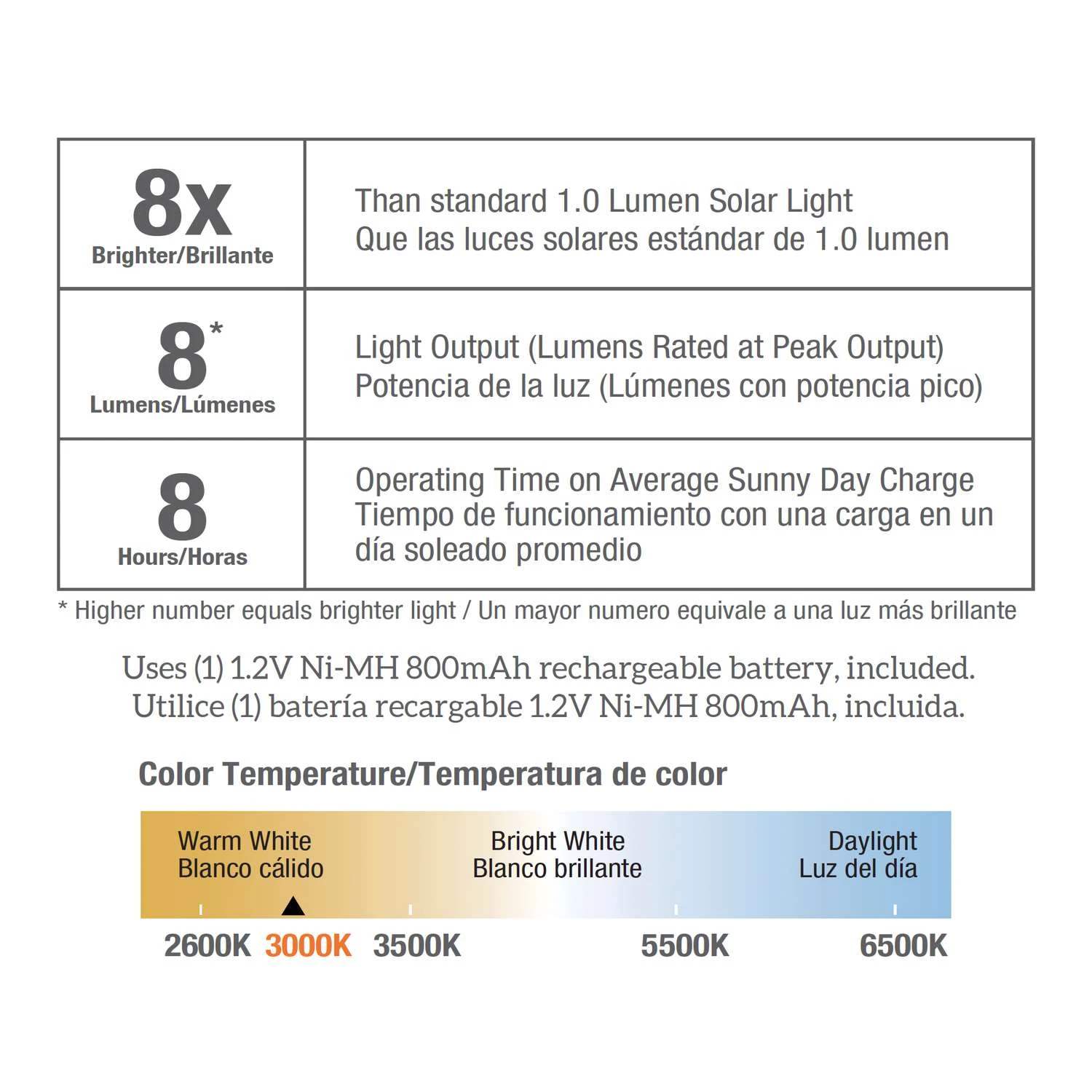 Illuminate your outdoor areas with this solar path light. Up to 8 hours of nightly runtime on a full solar charge. No wiring required, makes for easy set-up. Garden lights are great for landscape decoration outdoors. The best decorative solution for yard/lawn lighting, landscaping, gardening or place along the sidewalk. The perfect way to enhance your home Easy to install Long lasting