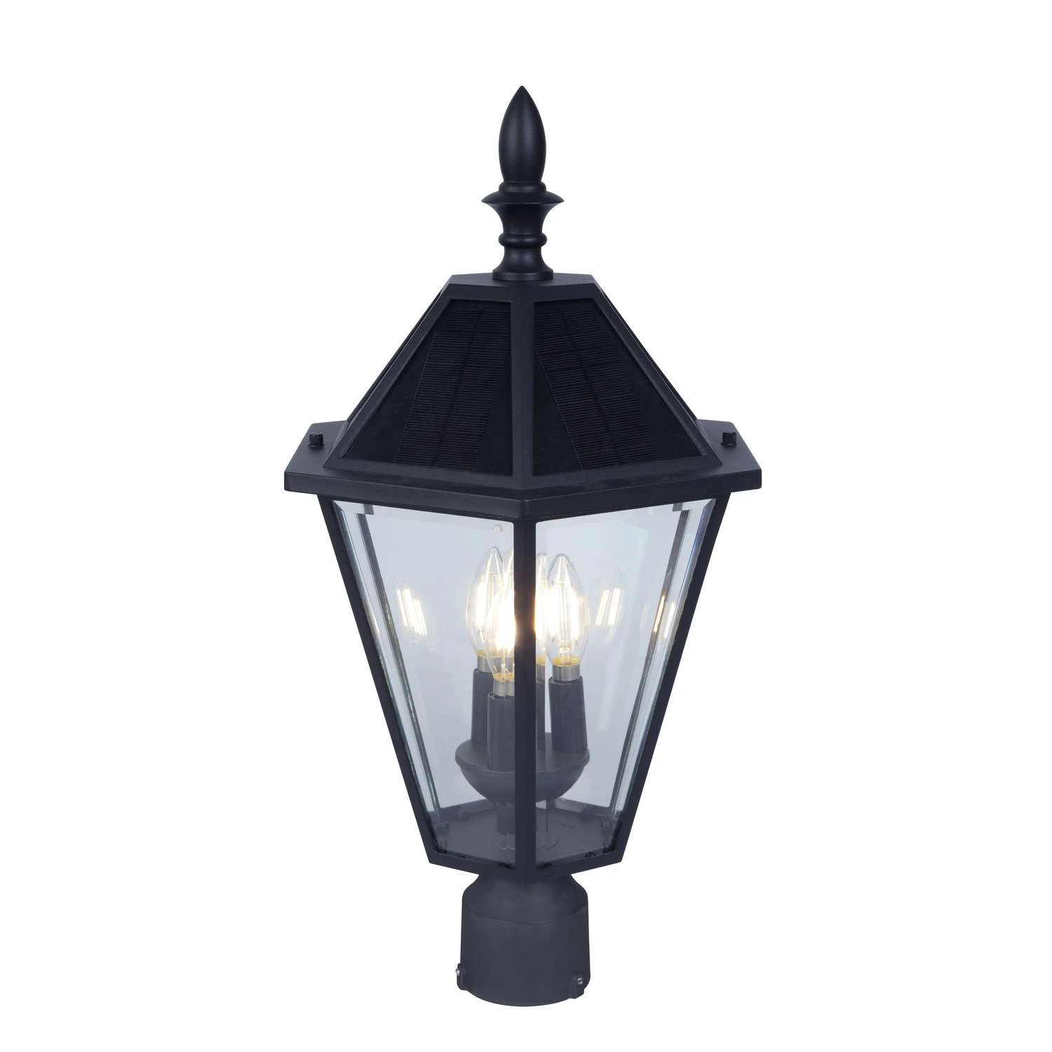 Illuminate your outdoor space with this 3-light Black Outdoor Solar Post Top Light. Ideal for any area because there’s no electricity needed. Features a pitched hexagonal roof with solar panels that charge the lithium battery. (Included) This will accommodate a 3″ diameter pier mount. (Sold separately) Constructed of sturdy cast aluminum for years of use Clear beveled glass enables the 300 lumens of bright light to shine through No wiring needed so it can be installed anywhere Clear beveled glass panels Suitable for wet locations
